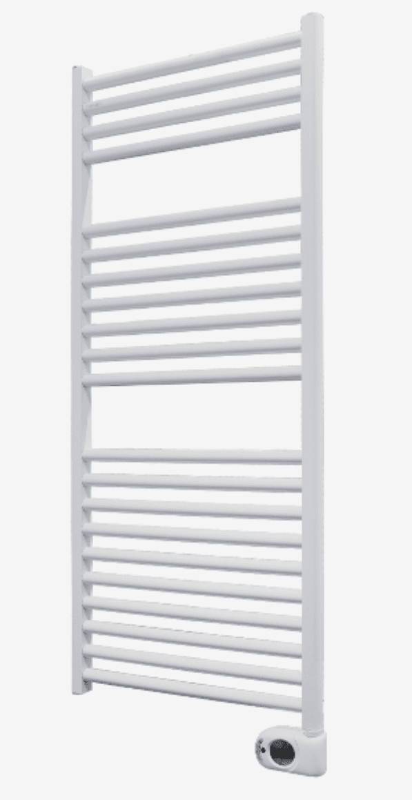 Alumiininen sähkötoiminen pyyhekuivain, jossa on LCD-näyttö ja ohjelmoitavat ajastintoiminnot päivittäiseen tai viikoittaiseen käyttöön.